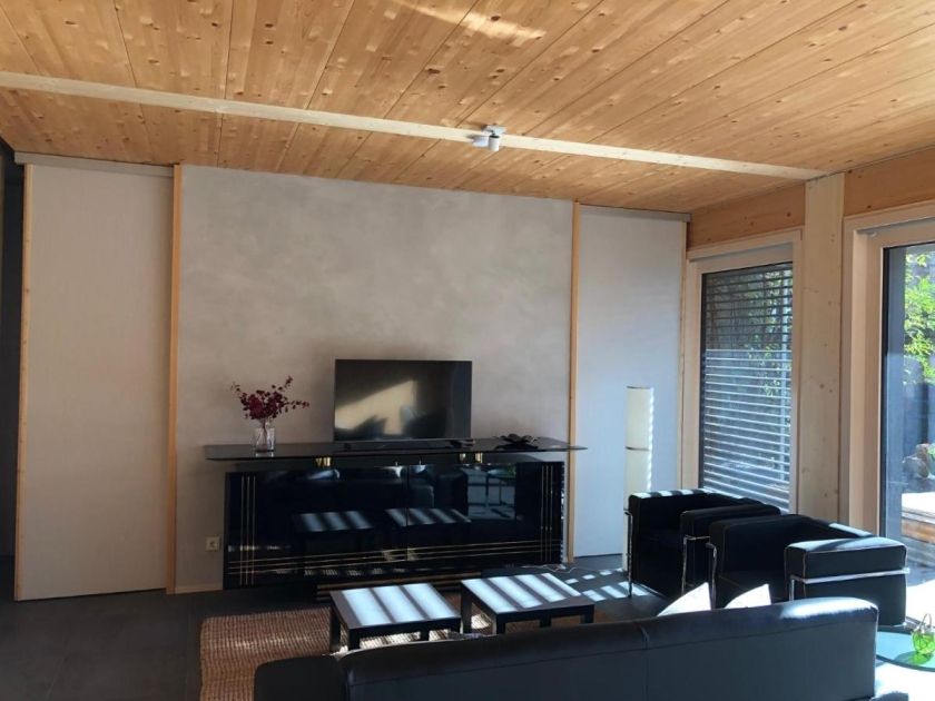 Das begrünte Flachdach wirkt klimatisierend, so dass wir bislang auf eine aufwendige Klimatechnik verzichten konnten. Beheizt wird die Ferienanlage durch eine Luft-Wärmepumpe. Die gewählte Baukonstruktion schirmt das Gebäude gegen gesundheitsschädliche Strahlungen wie Radon und elektromagnetische Wellen ab.
