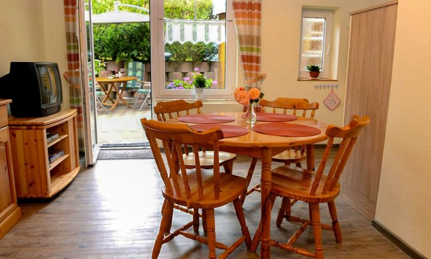- Wohnraum mit Couch, Sat-Farb-TV möglich, Essecke und Zugang zum Garten