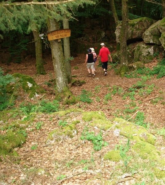 Wir überqueren den plätschernden Bach über einen neuen Holzsteg. Auf den nächsten 1500 m erwartet uns der schwierigste, aber auch spannendste Teil der Strecke. Zunächst kreuzt der Ruwer-Hochwald Radweg unseren Weg und wir folgen ein kurzes Stück dem Mertesbach. Steil geht es nun hinauf zu zwei imposanten Felsformationen aus Quarzit - zuerst zum Marjeterfelsen und kurze Zeit später zum Heckelbuschfelsen (490 m), der zugleich den höchsten Punkt der Wanderstrecke markiert. Oben angekommen, lädt eine Sitzgruppe zu einer wohlverdienten Verschnaufpause ein. Nach den Felsen geht es wieder hinunter in Richtung Hentern. In Blickweite des früheren Forsthauses biegen wir links in den Wald ab. Eine kurze Passage führt nun entlang der Kreisstraße zum Zerfer Bahnhof.