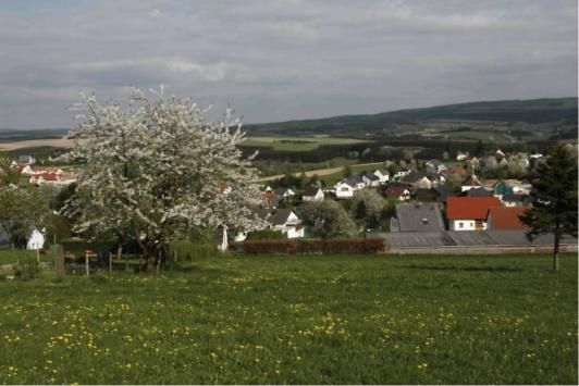 Entlang von Feld- und Weideflächen führt der Weg uns zum Ort Schillingen. Hier öffnet sich das Panorama jetzt auch Richtung Osburger Hochwald.