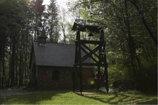 Wir betreten den Barfußpfad durch ein hölzernes Einstiegsportal, das auch gleichzeitig den Startpunkt der Traumschleife bildet. Für wenige Meter wandern wir entlang des Flonterbaches, bevor wir uns nach rechts wenden und die Fatima-Kapelle erreichen. Hier verleitet der Glockenturm die Wanderer dazu, mit dem Geläut der Glocke die Stille des Tannenwaldes zu unterbrechen.